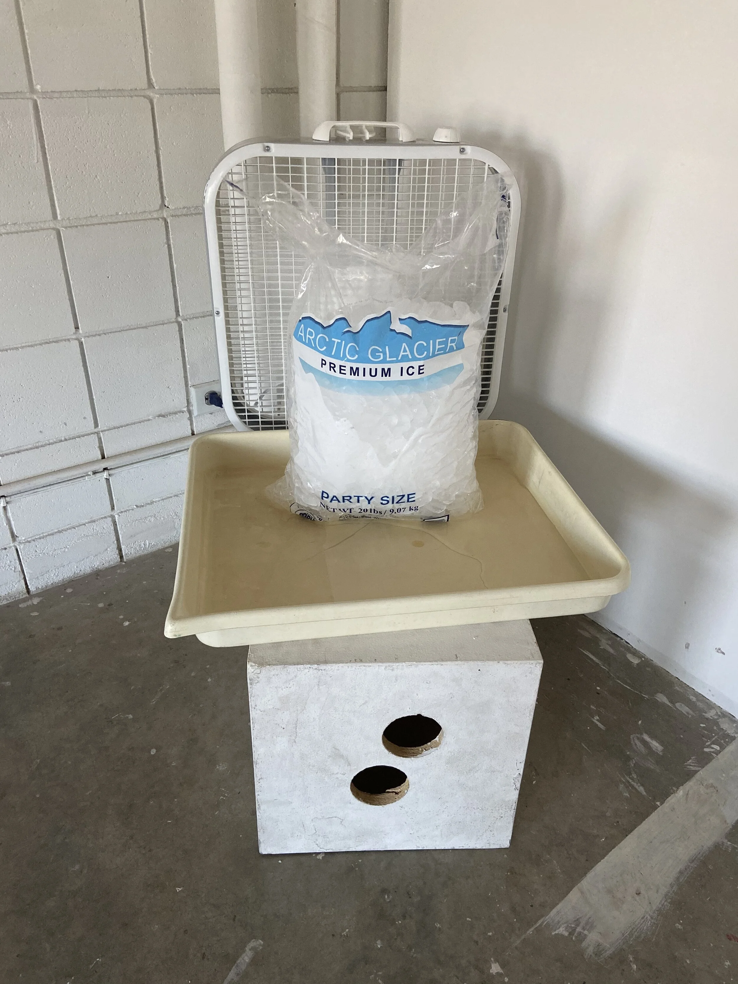 "Melting Tundra", October-September 2020, Installation CFA 171, Used water bottles, white rocks, fishing line, water, ice, fishing net, moss, cotton twine, fans, soil, twigs, acrylic
